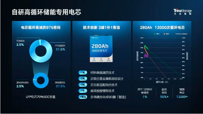 天合新一代工商储解决方案搭载自研车规级280Ah长寿命电芯,依托“3减1补1智造”技术,实现电芯循环寿命突破12000cls@70%SOH。优选高批次产品对外,采用高稳定性隔膜与正极材料,首创四面隔热Pack安全设计,于高热稳定、化学稳定、电气稳定等多层级上同频构建电芯安全体系。全面维护电芯本征安全性能,增强电芯在多维应用场景下灵活适配的可能性。
